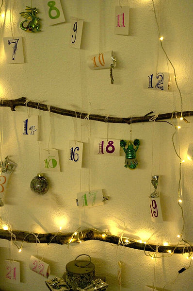 Beschmücke den Kalender mit Weihnachtskugeln oder Figürchen und Lichterketten.