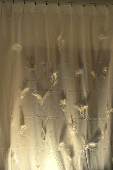 Um deinem Vorhang einen speziellen, weichen Effekt zu verleihen, kannst du mit Faden kleine Schlaufen in den Vorhang sticken. Nimm dir eine Feder und stecke sie in die Schlaufe.